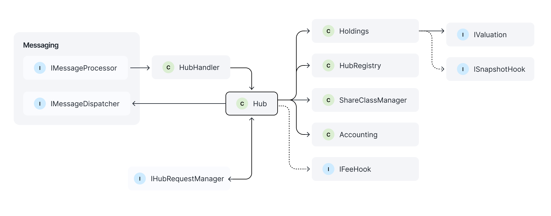 The HubHandler coordinates state updates across Hub, Holdings, and ShareClassManager based on incoming messages. It validates and routes request callbacks to appropriate HubRequestManagers registered per pool and destination chain, ensuring that vault operations flow correctly through the system. It also maintains snapshot state for cross-chain consistency, tracking when assets and shares are synchronized across different networks.